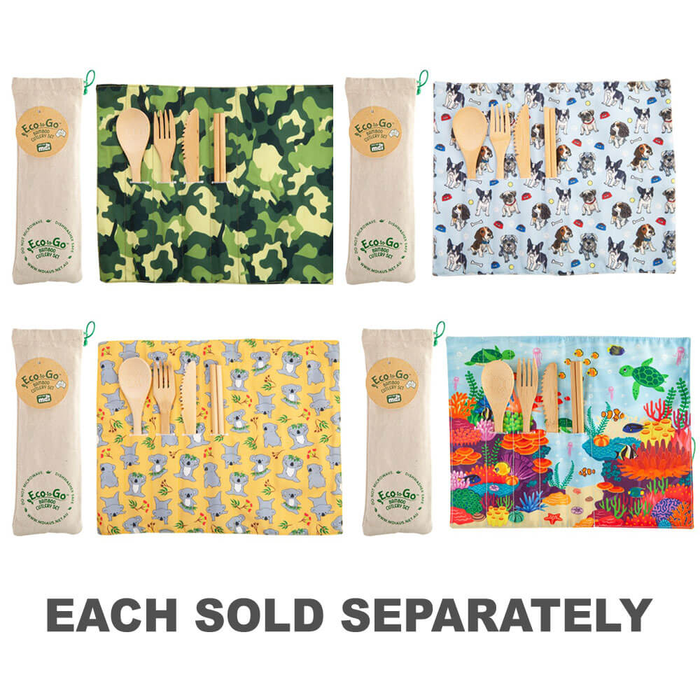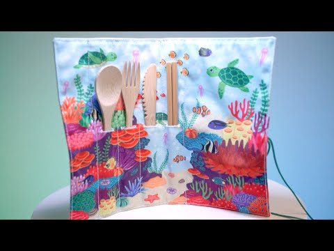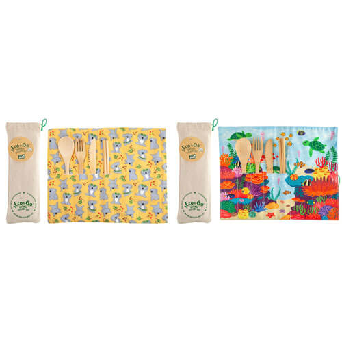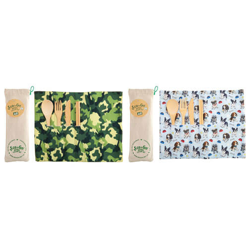 - O conjunto de talheres ecológicos feito de bambu, com um envoltório de viagem que funciona como um placemat.