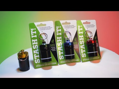 Mini frasco de armazenamento de alumínio em um chaveiro prático.