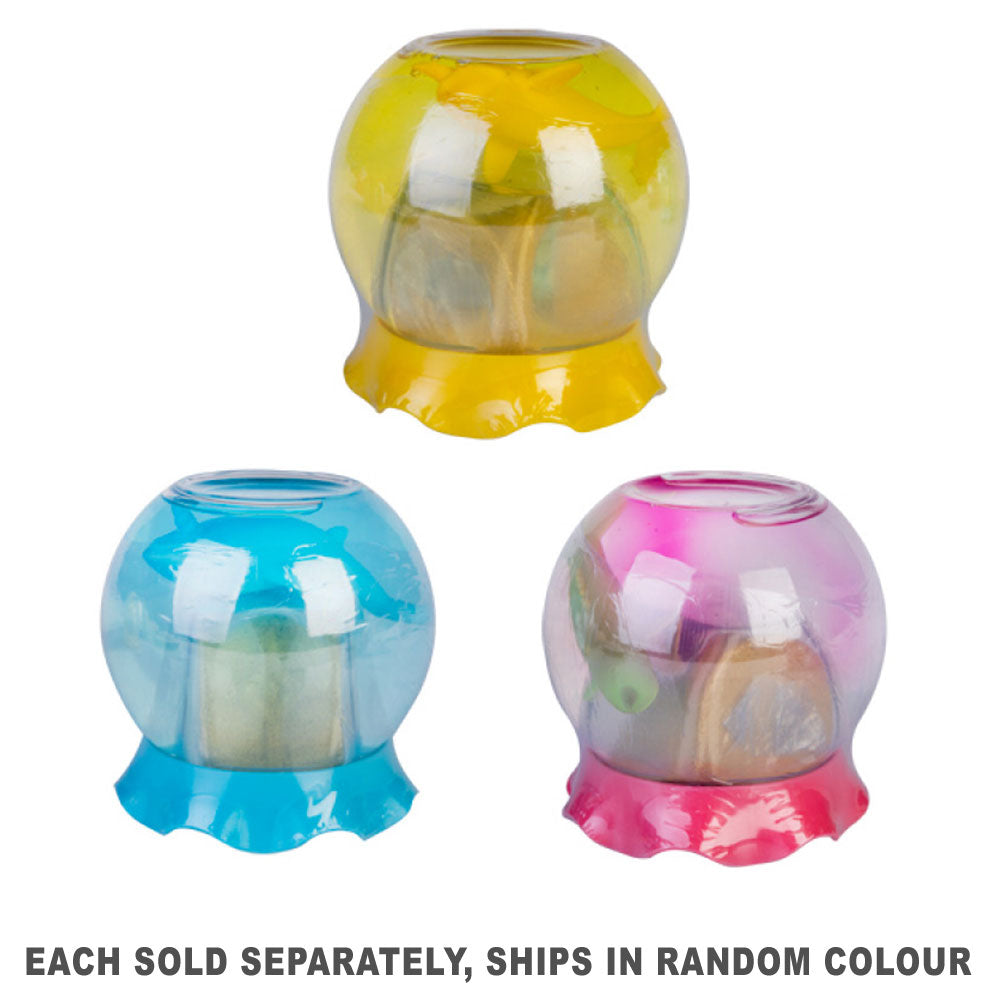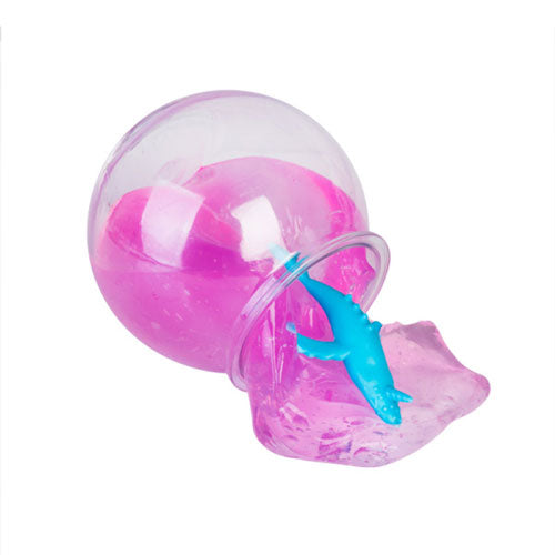 Ooey pegajoso lodo com uma criatura marinha nadando em cada um. Inclui baú do tesouro com surpresa misteriosa, esperando para ser escavado. Jarra em forma de peixe com tampa colorida combinando mantém o lodo sem poeira. Pode variar de 3 cores brilhantes.