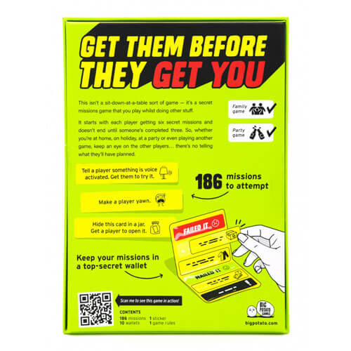 Com mais de 180 missões diferentes que podem ser tentadas em muitos cenários diferentes, este é um daqueles jogos de festa para adultos e adolescentes. Para começar, cada jogador recebe uma carteira de missão com seis cartões de missão, que eles mantêm em segredo de qualquer outra pessoa.