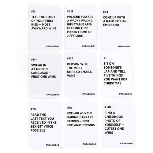 Hvem kan gøre det ... inkluderer 250 actionkort for at se, hvem i gruppen kan gøre det! Konkurrer mod dine venner om at gøre det bedste indtryk af dommeren, drikke et glas vand med en ske og ændre din telefonbaggrund til et foto af en skaldet mand.