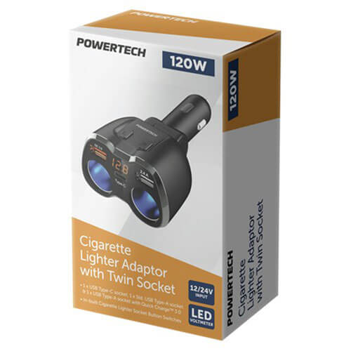 This unit converts the lighter socket in your car to dual cigarette socket with 1 x USB A 2.4amp socket and 1 x USB C 1 x USB A Qualcomm 3.0 quick charge socket. The onboard LED display also shows the current voltage of the cigarette socket its plugged into. The built in switches allow you to individually turn the cigarette sockets on or off on the adaptor its self.