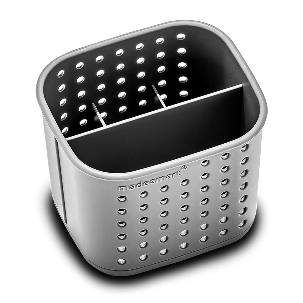 La estación de fregadero de bolsillo Madesmart mantiene las herramientas de lavado de platos ordenadas y contenidas. Los compartimentos interiores divididos proporcionan un espacio para esponjas, depuradores y varitas de plato, mientras que los agujeros de ventilación promueven un secado más rápido para mejorar el saneamiento. La base de drenaje desmontable permite una fácil limpieza, y el material de agarre suave protege las encimeras mientras mantiene la estación en su lugar.