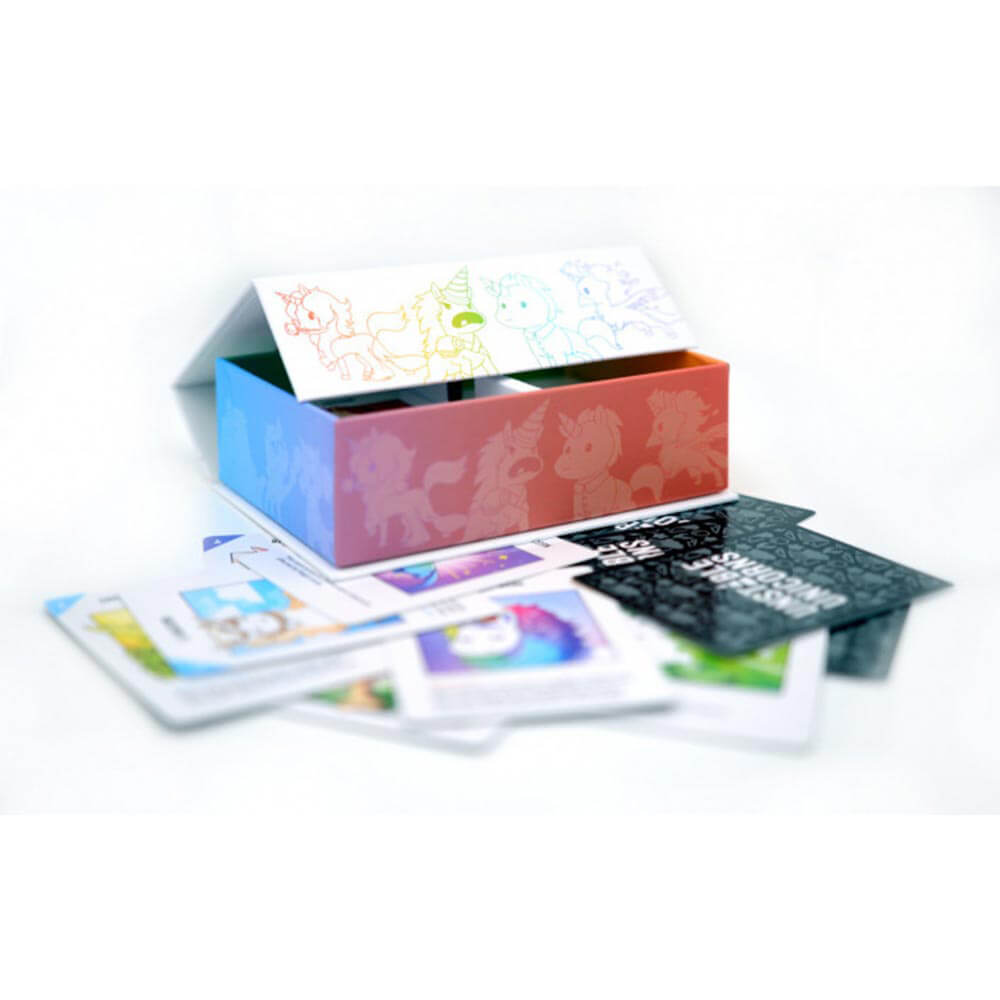 Pero no te apegues demasiado, ¡porque incluso los unicornios para bebés no están a salvo en este juego! Hay más de 20 unicornios mágicos para recolectar, y cada uno tiene un poder especial. ¡Construye tu ejército de unicornio tan rápido como puedas, o ser destruido por uno de tus llamados amigos! ¡Busca venganza o protege tu establo usando tu magia! ¿Suena fácil? No tan rapido. Alguien podría tener una tarjeta vecina (¿entiendes? ¿Vecinos?) Y enviar el juego a la locura! La primera persona en completar su ejército de unicornio será conocido como el gobernante justo de todas las cosas mágicas ... al menos hasta el próximo juego. Buena suerte.