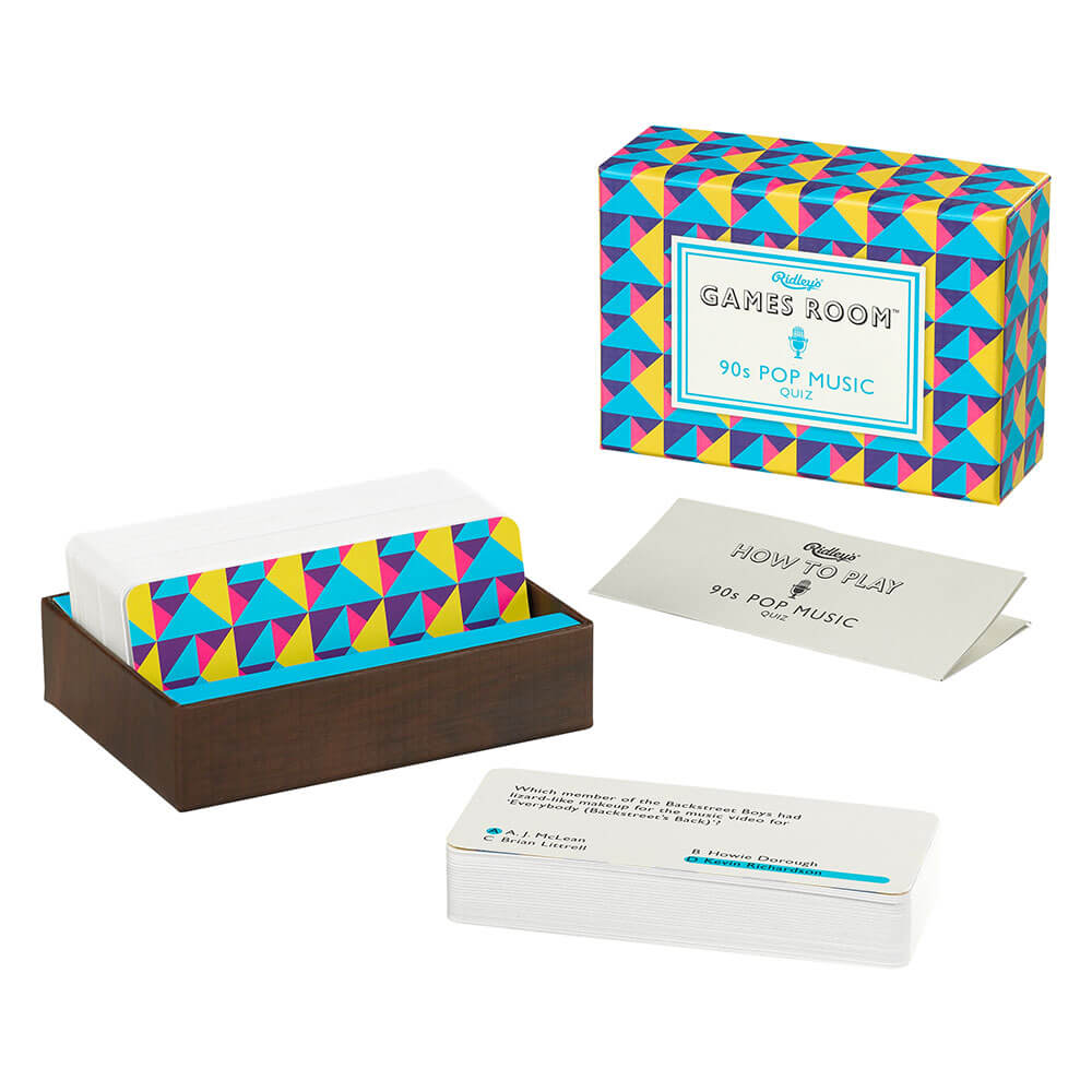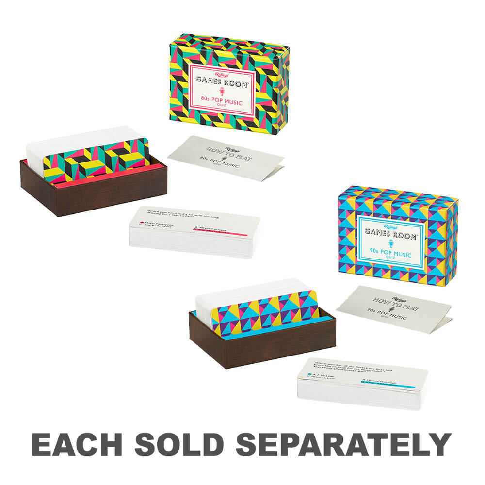 Estarás desenterrando tus viejos mixtapes al final de este cuestionario sobre música de los 80, con 140 tarjetas de preguntas de opción múltiple presentadas en una caja geométrica brillante inspirada en los 80.
