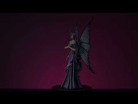 Estatueta de uma elegante fada roxa olhando amorosamente para um dragão bebê. Ela usa um espartilho adornado com penas e um vestido roxo esvoaçante para combinar com suas asas roxas brilhantes. Escultura detalhada e pintura com texturas realistas.