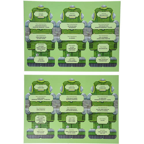 - O robô consiste em cinco ladrilhos, um ladrilho com regras para cada fase mais uma habilidade especial, que o robô usa durante o jogo.