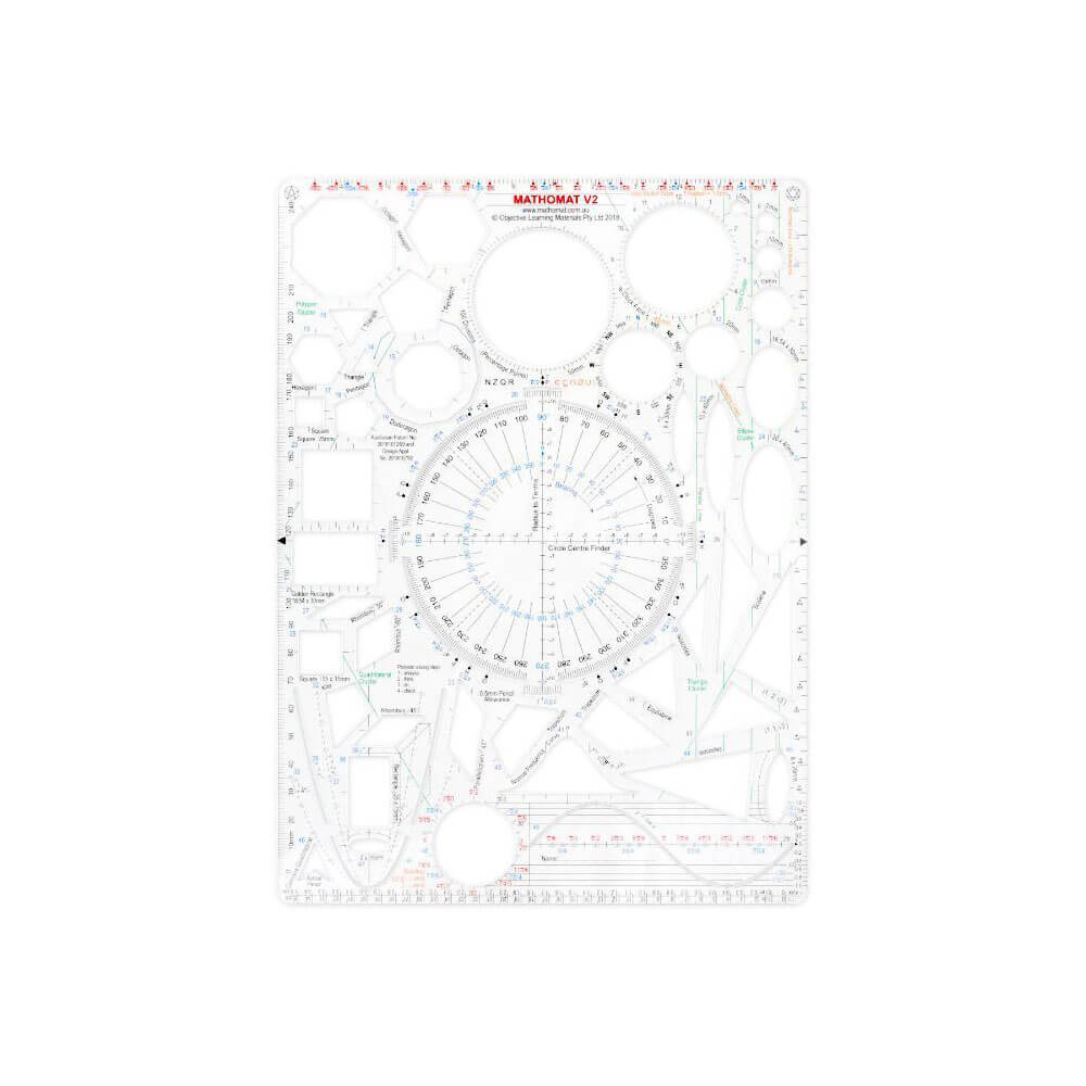 Os modelos Mathomat combinam muitas ferramentas em um único instrumento; governante, transferidor, círculos de substituição da bússola, muitas linhas numéricas e estênceis de formas geométricas, modelos de elipse, guias de gráficos e máquina de função trigonométrica.