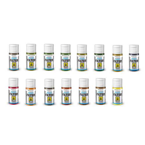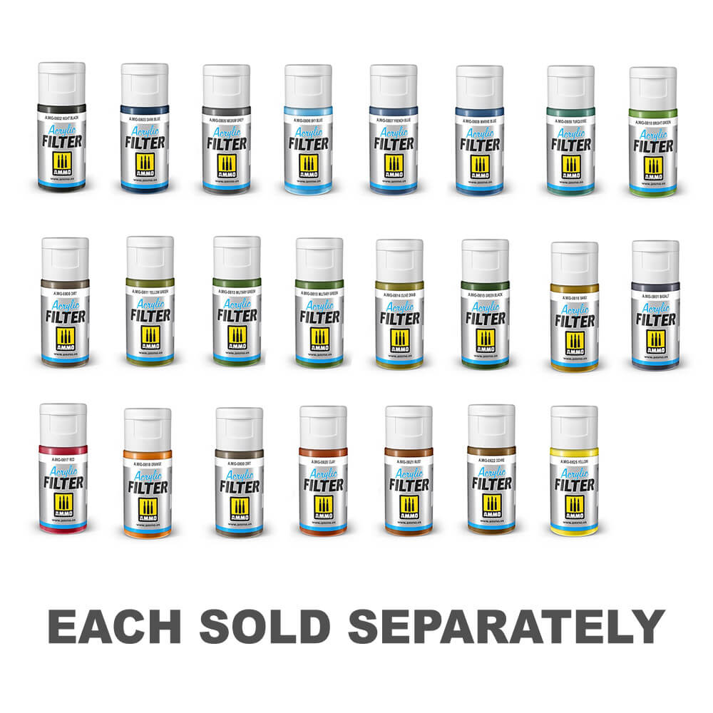 Os novos filtros acrílicos da Ammo são projetados para serem aplicados diretamente ao modelo. Esse novo intervalo permite adicionar variação de cores às suas miniaturas, harmonizar várias cores de camuflagem ou distinguir áreas com um tom diferente. O filtro acrílico pode ser facilmente aplicado com uma escova, o que evita a necessidade de mascaramento complicado. Umedece o pincel com o produto e aplique -o sem inundar a superfície. Graças à formulação inovadora, os filtros acrílicos podem ser retocados ou eliminados de maneira simples e facilmente com água durante o tempo prolongado, cada filtro secará completamente em 24 horas. Esses filtros versáteis também podem ser aplicados pelo airbrush para um número infinito de efeitos. Graças à ampla gama de 30 cores disponíveis, você não precisará fazer misturas complexas, ajustar a taxa de desbaste adequada ou ajustar o tom na tonalidade pretendida. Cada cor pode ser misturada entre si ou tingida com outros acrílicos de munição