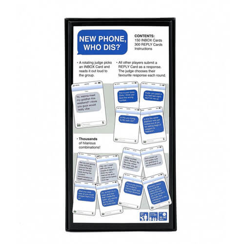 300 cartes de réponse, imprimées sur des cartes à jouer premium (épaisses avec finition brillante); Enveloppé de rétrécissement dans une boîte personnalisée.