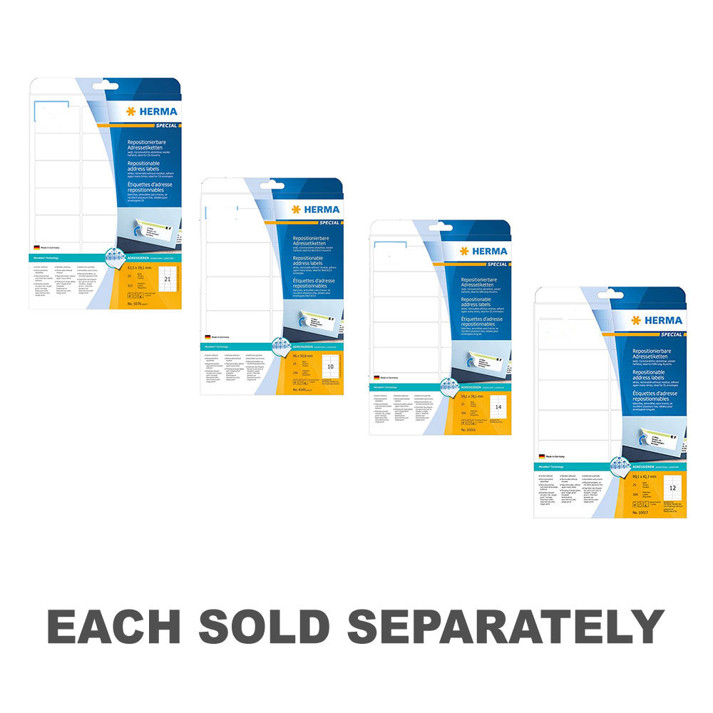 Simplify your mailing tasks with Herma Adhesive Address Labels! This pack includes 25 A4-sized labels, each featuring a white finish for clear, professional-looking prints. Designed with a strong adhesive backing, these labels adhere securely to envelopes, packages, or shipping boxes, ensuring your mailings reach their destination securely. Whether for business correspondence, personal mailings, or organizational needs, these Herma labels offer reliability and convenience for all your address labeling tasks. Get ready to streamline your mailing processes with Herma Adhesive Address Labels!
