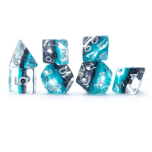 • Kleuren: middernacht zwart en dromen van groenblauw - zilvernummering. Eclipse -dobbelstenen zijn gelaagde dobbelstenen (4) met twee dunne lagen heldere parelmoerde kleur genesteld tussen twee perfect heldere transparante buitenste lagen!