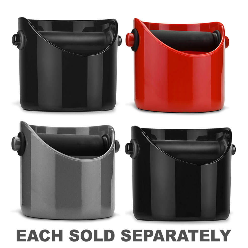 Het heeft een slanke, moderne look en is verkrijgbaar in drie kleuren en twee maten die passen bij uw stijl - capaciteit van 445 ml (rood, grijs, zwart) of 825 ml (alleen zwart). Wanneer het niet in gebruik is, is deze aantrekkelijke koffiekoos met een laag profiel ontworpen om recht in de druppel van uw espressomachine uit de weg te zitten, waardoor de aanrechtruimte of kastruimte wordt bespaard! Bovendien heeft de Coffee Knock-doos een niet-slip rubberen grip op de bodem zodat deze blijft zitten als je het nodig hebt