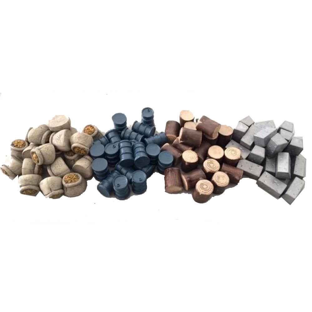• Inbegrepen zijn 80 tokens: 20 korrelzakken (voedsel), 20 ijzeren ingots (metaal), 20 olievaten (olie), 20 gehakt hout (hout)