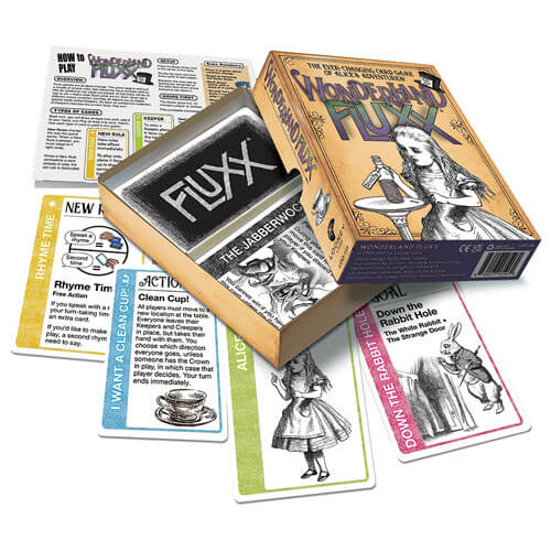 In Wonderland Fluxx ga je door het konijnenhol om lid te worden van Alice terwijl ze thee heeft met de gekke Hatter, krijgt aanwijzingen van de Cheshire Cat, probeert te redeneren met Tweedle Dee en Tweedle Dum, en groeit en krimpt alarmerend. Misschien moet je zelfs een jabberwock verslaan om te winnen bij deze gelijkmatige nieuwsgierige versie van fluxx ...