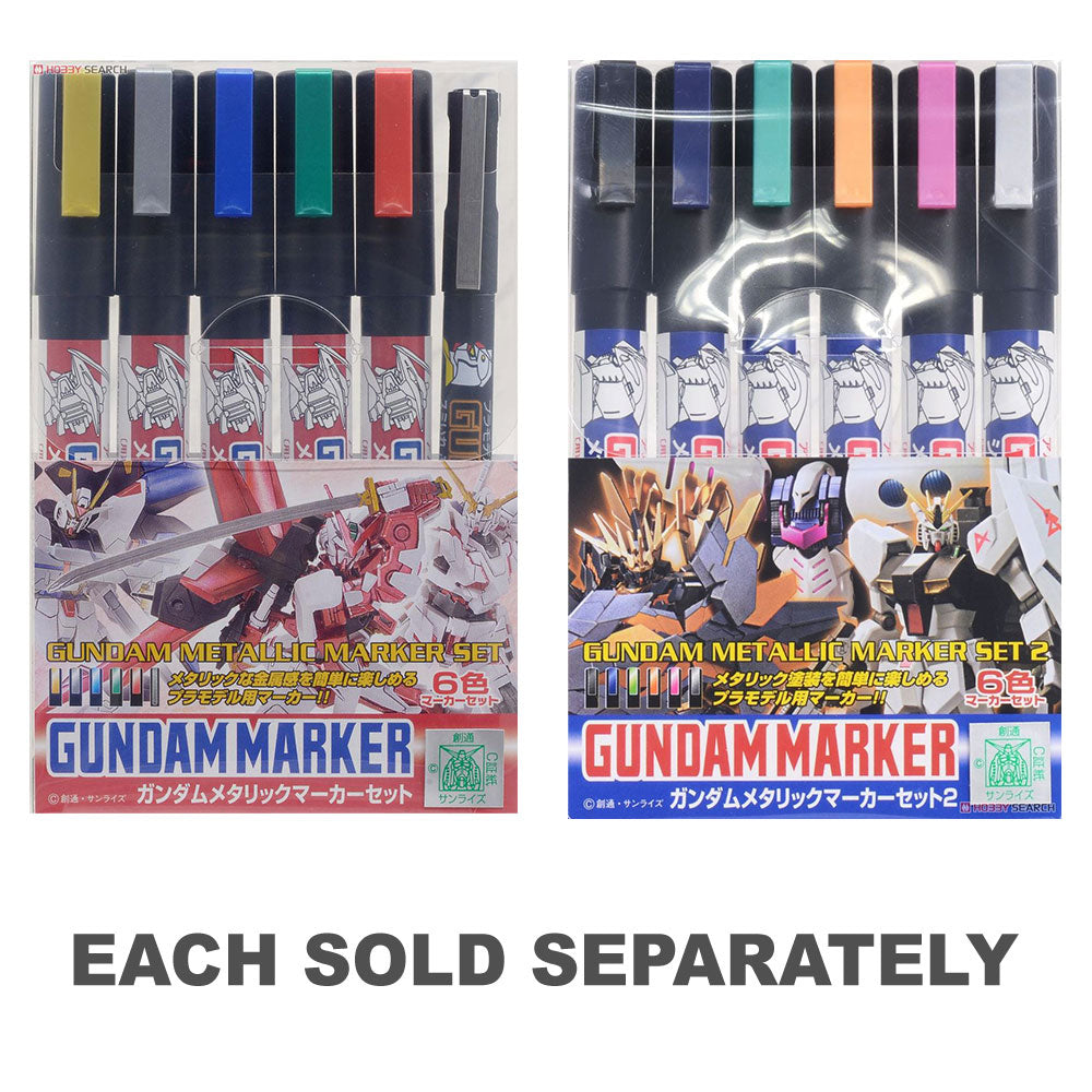 The Gundam Metallic Marker Set - 1 includes a range of metallic colors perfect for Gunpla model detailing. These markers offer high-opacity coverage and quick-drying ink to ensure a smooth application. Ideal for both touch-ups and creative customization, they bring a unique metallic sheen to your builds.