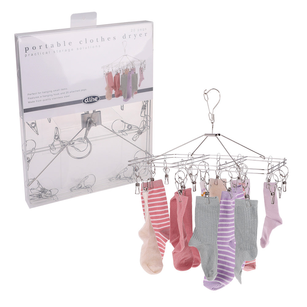 Denne rustfrie stålet RECTangle klær tørketrommel - 20 knagger fra D.Line er perfekt for å henge små gjenstander, selv på det mest kompakte rommet. Denne kompakte tørketrommelen har en hengende krok og 20 festede knagger, og er flott for å reise, og brettes bort for enkel lagring.