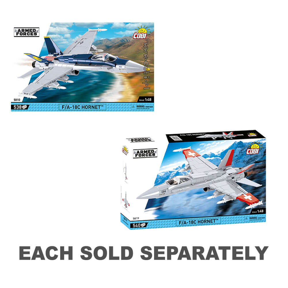 F/A-18C Hornet er en unik multirol-jagermodell i fargene i Sveits. Flyet ble fremstilt i en skala på 1:48 ved bruk av 540 COBI -konstruksjonsblokker. Settet inkluderer utskrifter av høy kvalitet som imiterer maleriet av det opprinnelige flyet. Modellen er utstyrt med en sammenleggbar understell og roterende hjul. Under vingene er et stort arsenal av våpen. Du kan plassere en spesiell pilotfigur i hytta. Settet inkluderer også en blokkvisningsstativ og en plate med navnet på flyet. Dette eksklusive, lisensierte settet er rettet mot alle, uavhengig av alder, inkludert luftfart og militære fans. Flyet ser like attraktivt ut på et kontor eller på et tenåringsrom.