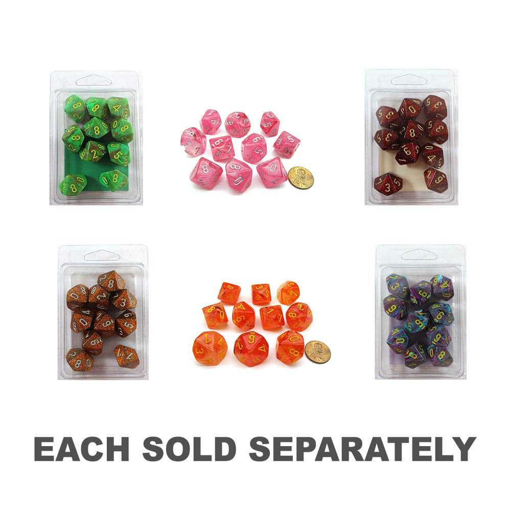 Ten zestaw 10 kości, styl i dobrze się toczy i będzie doskonałym dodatkiem do każdej gry lub kolekcji. Najważniejszy numer jest używany na rolce. Krawędzie pozwalają na łatwe rozpoznawanie kształtu, a liczby są mniej więcej tak duże, jak to możliwe na każdej twarzy. Zestaw ten obejmuje 10 D10 (dziesięcioboczne) kości. Kości są dostępne w opakowaniu detalicznym w klapkach. Każda matryca mierzy około 16 mm wysokości (wysokość pomiaru, podczas gdy matryca siedzi płasko). Mierzą ~ 23 mm od punktu do punktu.