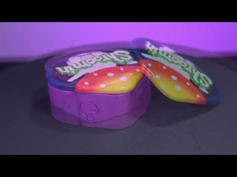 - Apresenta um cogumelo vermelho sorridente com frase punosa 'shroomin'