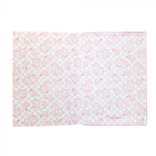 The Pusheen Fruits Plush Notebook is wrapped in a pastel pink, fluffy cover. Detailed with a playful blue and yellow banana sticker featuring Pusheen as an adorable banana, alongside the word 'fresh' and the number #4011, symbolizing standard produce. Embrace creativity and comfort in one delightful package.