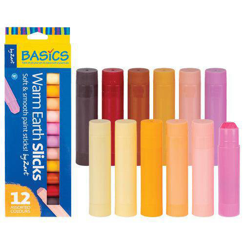 Slicks by Zart Warm Earth 12's, are a super smooth lipstick-like paint stick. Slicks glide easily on a variety of surfaces and they produce intense results! Fast drying and washable, they are ideal for all ages, and are an excellent clean and portable painting solution. The easy to use twistable mechanism means no sharpening is required.