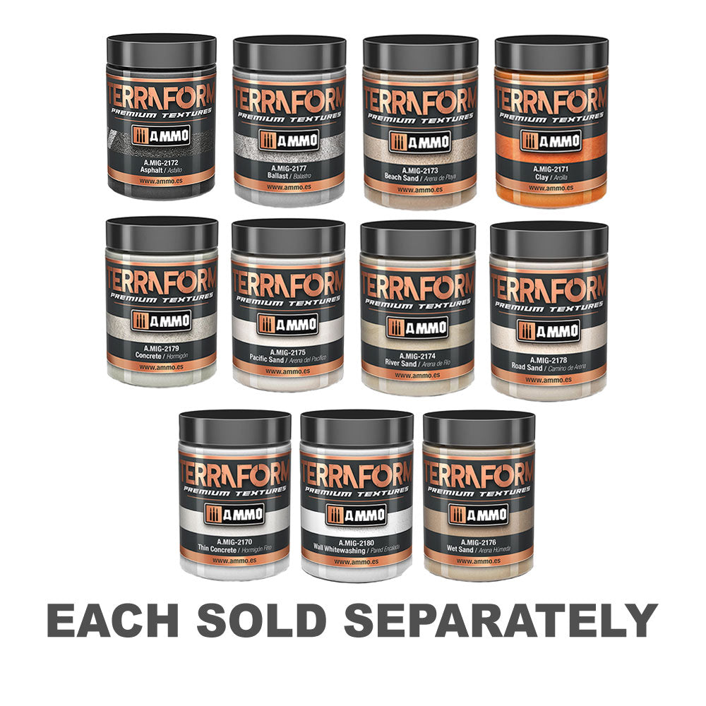 Med denna nya akrylformulering gjord med naturliga mineraler, gjorde det möjligt för dig att autentiskt återskapa ett brett utbud av strukturer, såsom betong, sand, asfalt, lera och ballast. Denna produkt, akryl, giftfri och luktfri, presenteras i 100 ml kapslar. Det torkar helt inom 24 timmar och kan blandas med andra liknande produkter från våra texturer. Det är lämpligt för alla skala från 1/16 till 1/48.