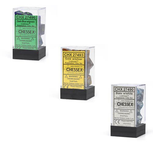 Signaturtärningar är en sammanställning av de bästsäljande färgerna på nya tärningar som släppts under de senaste åren. Det innehåller ett brett utbud av färger och material, men var och en är ett unikt och intressant tillskott till alla tärningssamlingar. Denna uppsättning innehåller en D20, en D12, två D10 (00-90 och 0-9), en D8, en D6 och en D4.